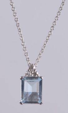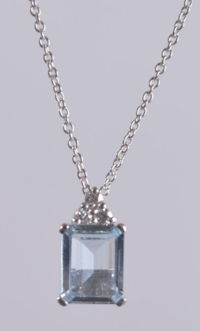 AN 18CT GOLD AQUAMARINE PENDANT on a chain.