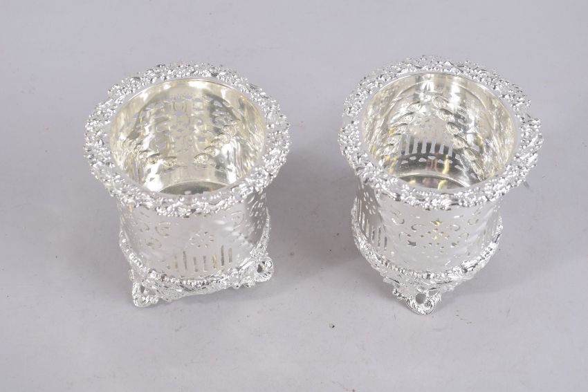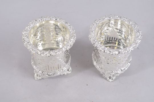 A PAIR OF PIERCED PLATED BOTTLE COASTERS.
