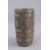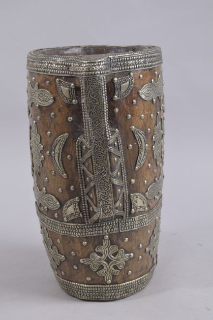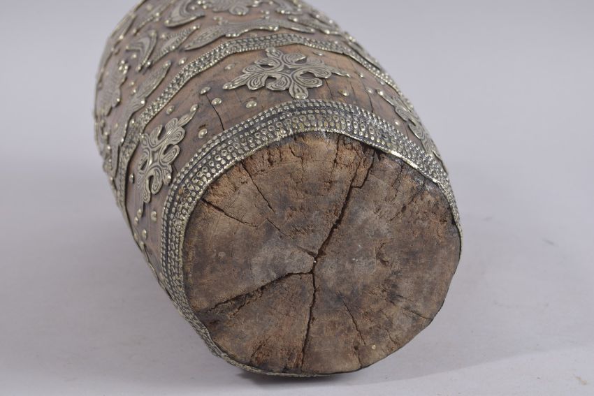A WHITE METAL CLAD HOLLOWED WOOD MORTAR with handle.