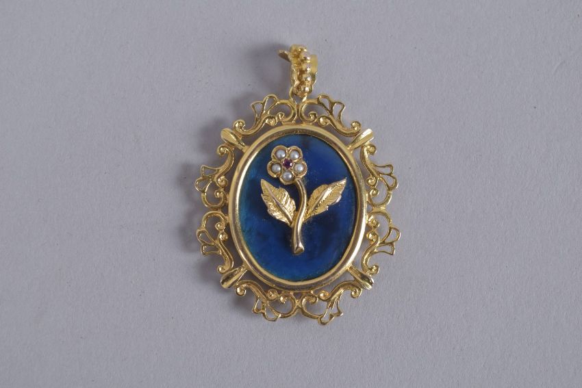 A 9CT GOLD, BLUE ENAMEL AND PEARL PENDANT.