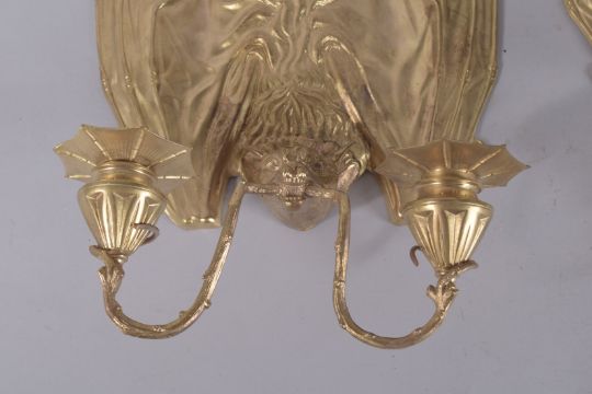 A GOOD PAIR OF GILT BRONZE BAT TWO-LIGHT WALL SCONCES.