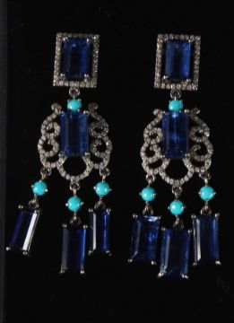 A SILVER, GOLD POST CHANDELIER KYANITE, DIAMOND AND TURQUOISE EARRINGS.