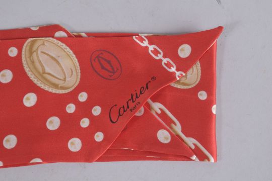 A CARTIER RED CHAIN PATTERN LONG SILK TIE.