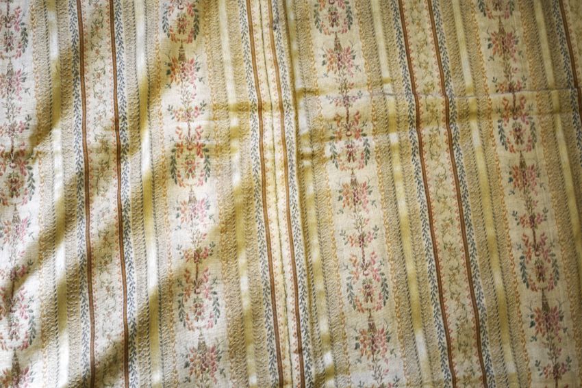 A PAIR OF LONG YELLOW SILK BROCADE CURTAINS.