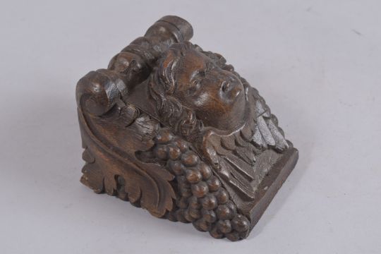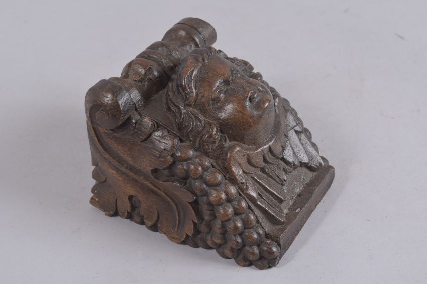 AN EARLY CARVED WOOD ANGEL HEAD BRACKET.