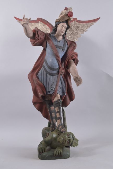 AN 18TH CENTURY CARVED AND PAINTED WOODEN FIGURE OF ST GEORGE.