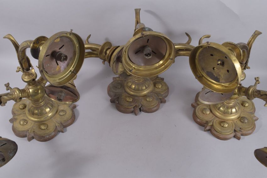 AN IMPRESSIVE SET OF THREE TRIPLE LIGHT WALL LIGHTS, PROBABLY GOTHIC.