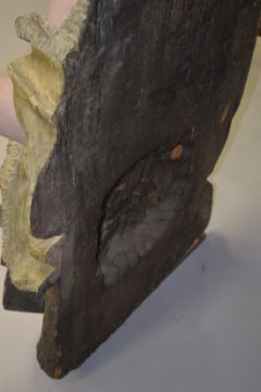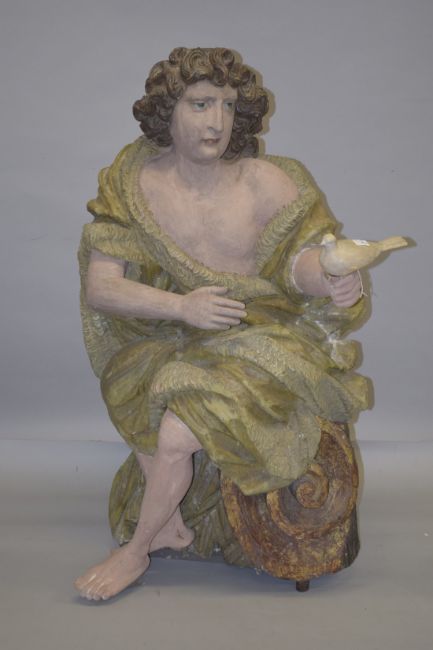 A GOOD CARVED WOOD PAINTED FAIRGROUND FIGURE, a classical man holding a dove.
