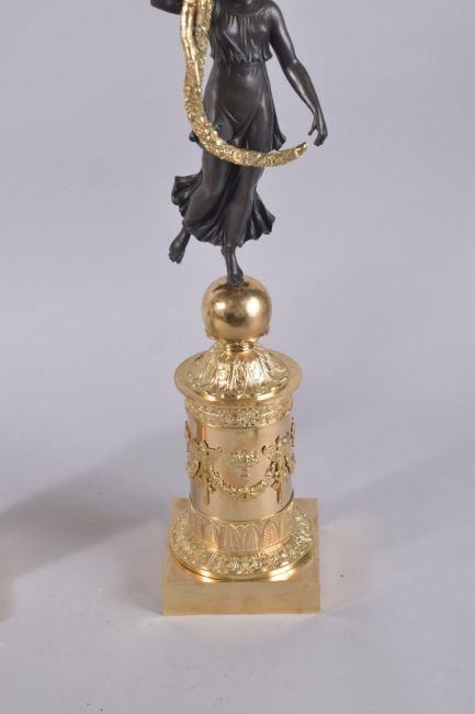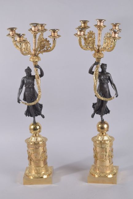 A GOOD PAIR OF THOMAS HOPE FIVE-LIGHT CANDELABRA with bronze classical female figure, supported on pedestal bases.