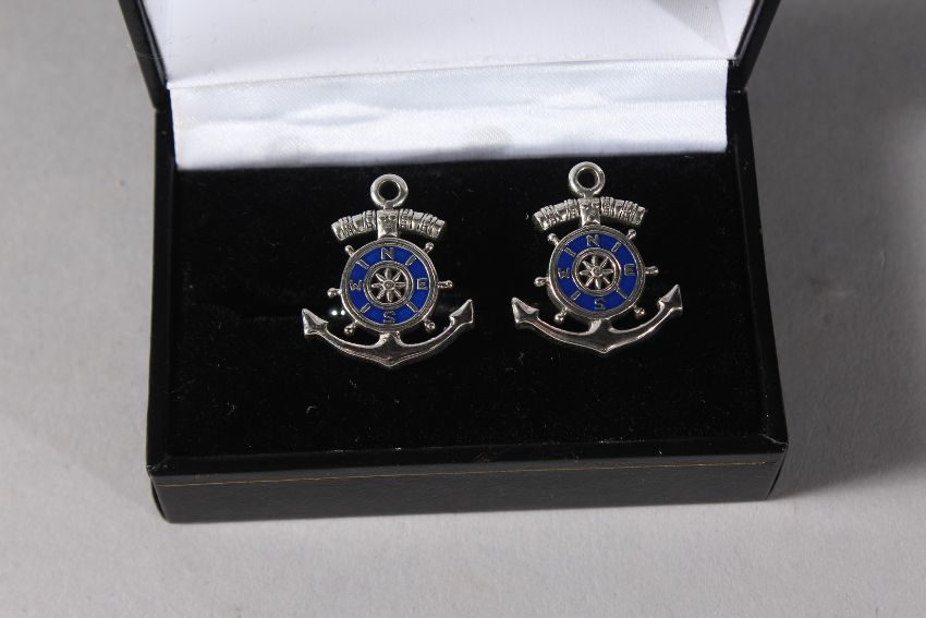 A SILVER ANCHOR AND SHIP'S WHEEL ENAMEL CUFFLINKS.