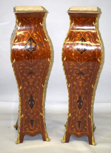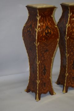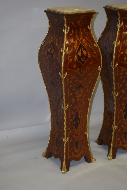 A GOOD PAIR OF LOUIS XVI STYLE INLAID PEDESTALS with ormolu mounts and square marble tops.