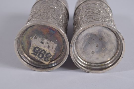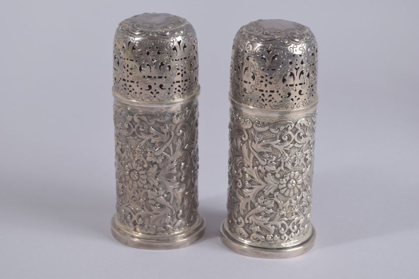 A PAIR OF SCOTTISH SILVER DRUM SUGAR SIFTERS with repousse decoration.