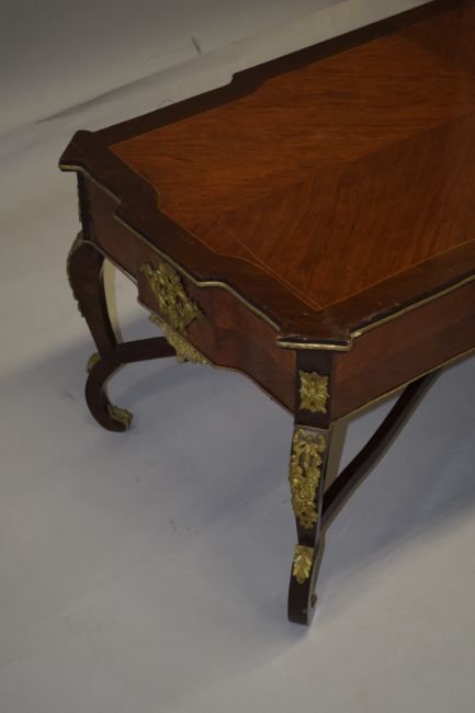 A LOUIS XVI STYLE RECTANGULAR TOP COFFEE TABLE with ormolu mounts, on four curving legs with cross stretchers.