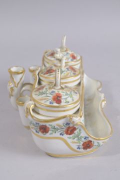A GOOD PORCELAIN TABLE INKSTAND, POSSIBLY SPODE, with gilt decoration painted with figures with three pots, pen holder and pen tray.