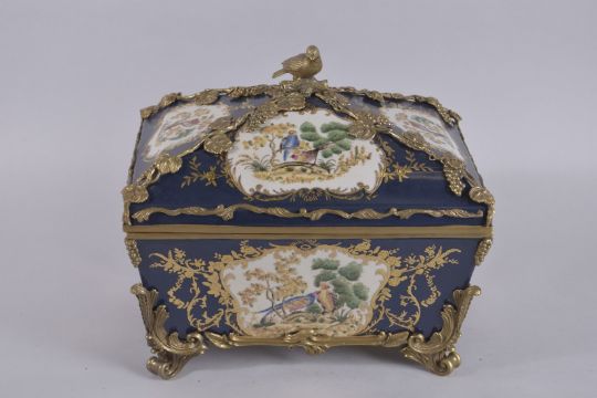 A GOOD CONTINENTAL PORCELAIN CASKET AND COVER, painted with birds and flowers, with gilt metal mounts.