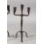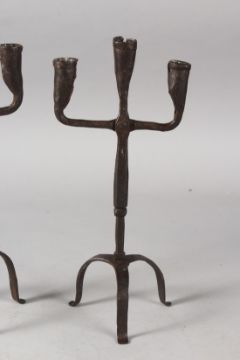 A PAIR OF METAL FORGED CANDLE HOLDERS on tripod bases.