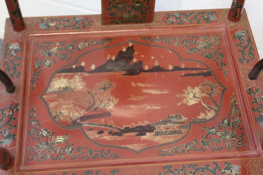 A PAIR OF CHINESE RED, BLACK, AND GILT LACQUER ARMCHAIRS, decorated with landscape panels, dragons, and floral motifs, 120cm high, 64cm wide.