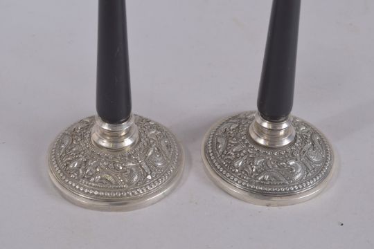 A PAIR OF CHINESE SILVER AND TURNED WOOD CANDLESTICKS.