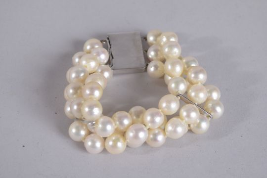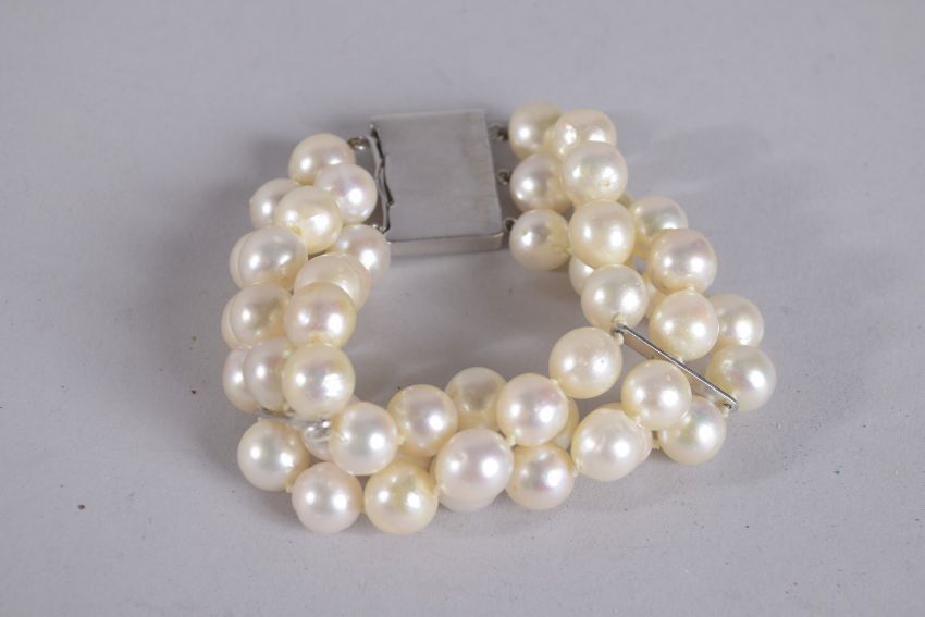 A GOLD TRIPLE ROW PEARL BRACELET with 18ct white gold clasp.