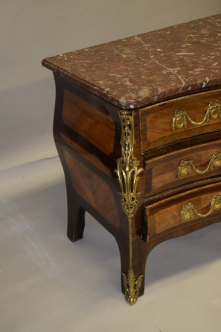 A LARGE 18TH CENTURY LOUIS XVI BOMBE FRONTED COMMODE with thick marble top, three long drawers with ormolu handles and mounts, and supported on curving legs.
