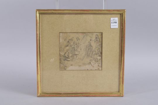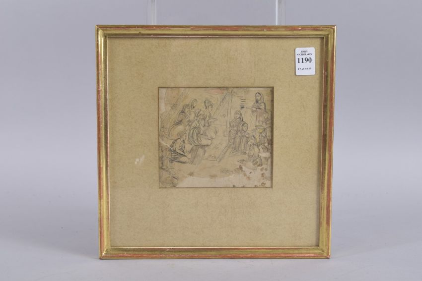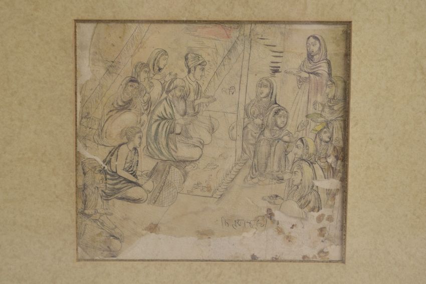 A VERY FINE INDIAN MINATURE DRAWING ON PAPER OR HIDE, depicting a scene with Mohamedan Zenana inviting Mullas and their females to dinner and prayer, inscribed lower right, framed and glazed, image 11.5cm x 13cm.