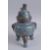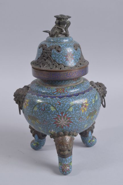A CHINESE BLUE GROUND CLOISONNE TRIPOD CENSER AND COVER, 30cm high.
