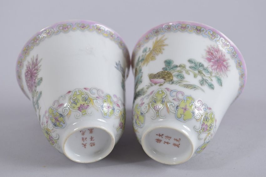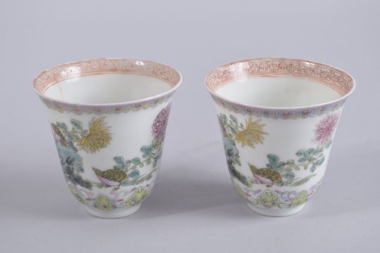 A PAIR OF 19TH CENTURY CHINESE FAMILLE VERTE PORCELAIN CUPS, each with character mark to base, 9cm diameter.