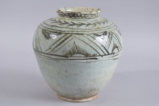 A PERSIAN GLAZED POTTERY JAR, 23cm high.