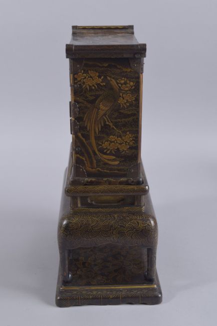 A FINE JAPANESE MEIJI PERIOD GILDED BLACK LACQUER SECTIONAL MINIATURE CABINET, finely decorated with various birds and flora, the reverse depicting mt. Fuji, with drawer to the top and two doors opening to reveal miniature shelves and small drawer, cabinet raised on stand, 38cm high.