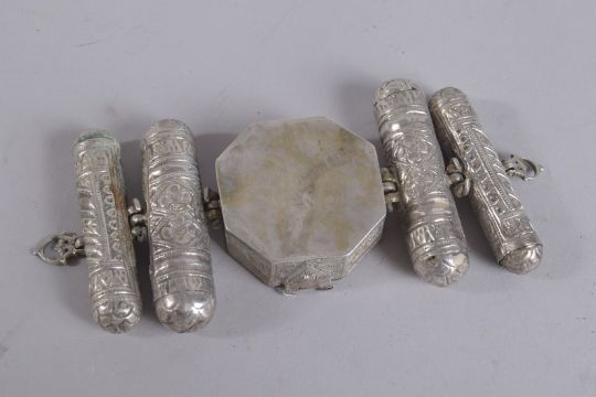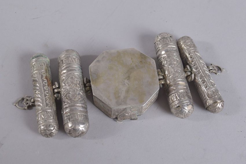 A 19TH CENTURY PERSIAN QAJAR SILVER LARGE AMULET CASE SET, 17cm wide.