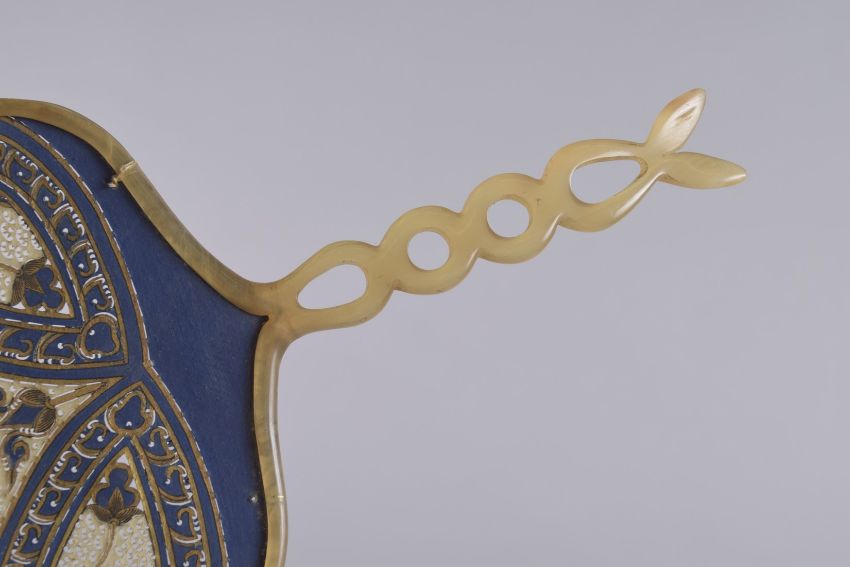 A VERY FINE 19TH CENTURY THAI OPENWORKED GILDED LEATHER AND HORN HAND FAN, 30cm long.