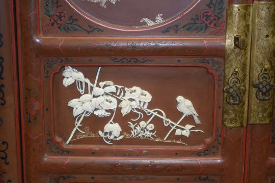 A VERY FINE CHINESE RED LACQUERED CABINET, with inlaid ivory figural decoration with birds and flora, the doors opening to reveal two shelves, 114cm high, 79cm wide, 52cm deep. Submission reference: V33V5K9U