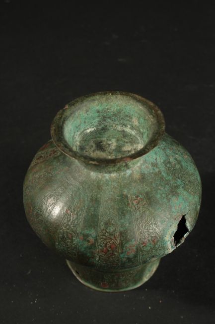 A 12TH-13TH CENTURY SELJUK KHORASAN SILVER INLAID VASE, with calligraphy and engraved scrolling vine, 15.5cm high.