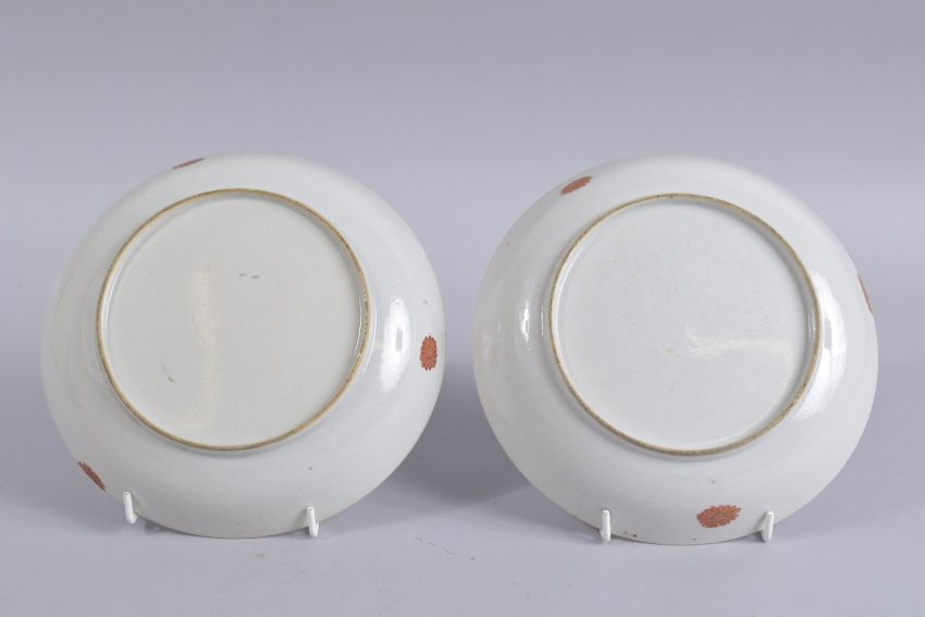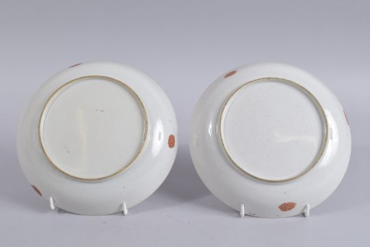A PAIR OF 18TH CENTURY CHINESE FAMILLE ROSE PORCELAIN DISHES, painted with floral motifs, 20cm diameter.