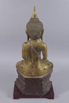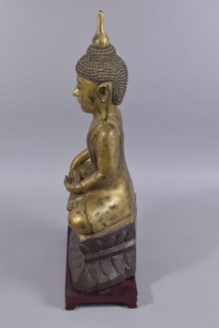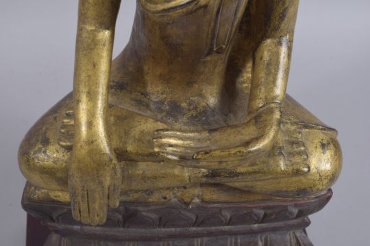 A FINE 18TH CENTURY BURMESE GILDED CARVED WOOD BUDDHA, seated upon a lotus base, together with rectangular hardwood stand and certificate: Naga arts & antiques, 28th September 2006, 65cm high.