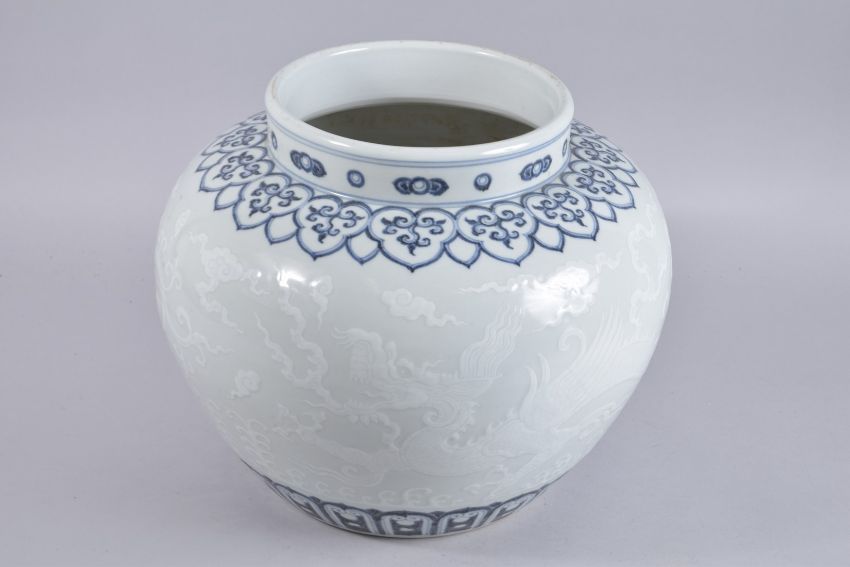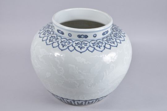 A VERY LARGE CHINESE BLUE AND WHITE CARVED KUI DRAGON JAR, 30cm high.