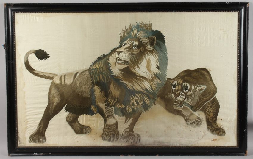 A FINE AND LARGE JAPANESE EMBROIDERED SILK TEXTILE PICTURE OF A LION AND LIONESS, framed and glazed, 77cm x 120cm overall.
