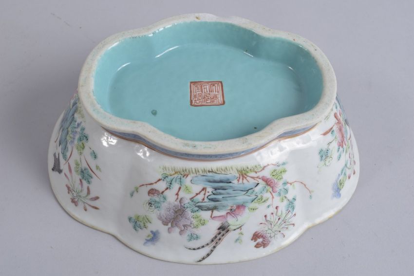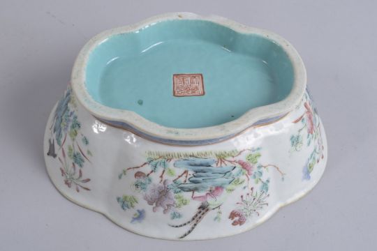 A CHINESE FAMILLE ROSE PORCELAIN QUATREFOIL PLANTER, painted with birds and flora, the interior with turquoise glaze, character mark to base, 22.5cm wide.