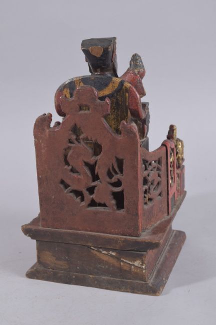 AN 18TH-19TH CENTURY CHINESE CARVED AND PAINTED WOODEN EMPEROR AND THRONE, in two pieces with the emperor figure settled within the wooden throne, overall height 29cm high.