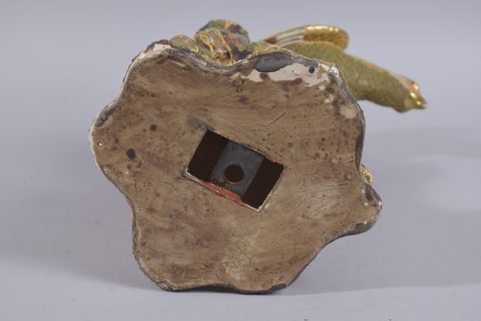 A LARGE JAPANESE GILDED AND ENAMEL PAINTED POTTERY FIGURE OF AN EAGLE ON A ROCKY OUTCROP, 32cm high.