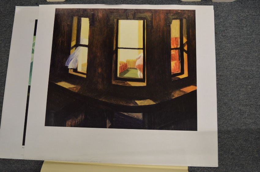 After Henry Scott Tuke, boys fishing from a rowing boat, black and white print and a collection of unframed posters after Edward Hopper.
