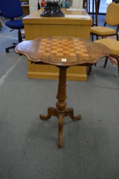 A Victorian walnut tripod drop-flap games table with drawers to each end and inlaid chess board top.
