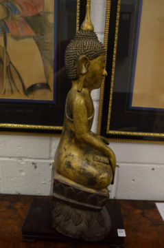 A fine 18th century Burmese gilded carved wood Buddha, seated upon a lotus base, together with a rectangular hardwood stand and certificate: Naga arts & antiques, 28th September 2006, 65cm high.
