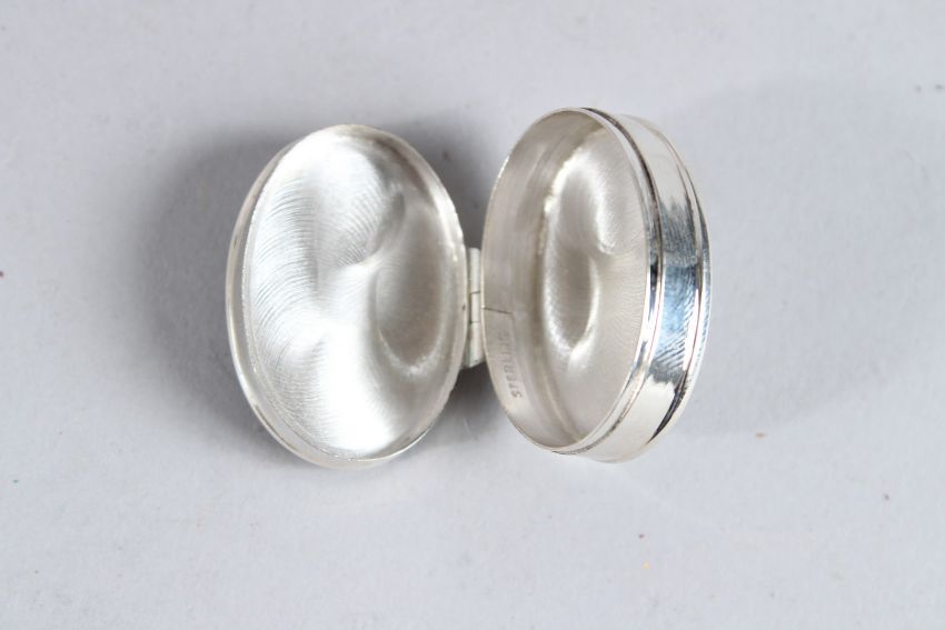 A SILVER OVAL PILL BOX with a spaniel.