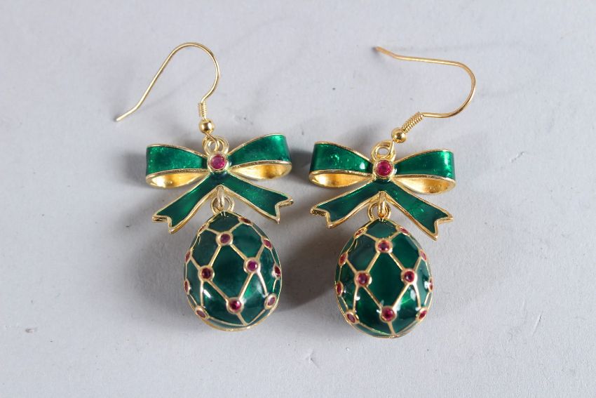 A PAIR OF RUSSIAN GREEN ENAMEL EGG EARRINGS.