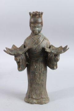 A CHINESE ARCHAIC BRONZE FIGURAL CANDLESTICKS.