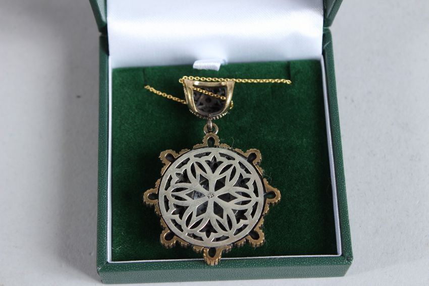 A SILVER GILT, RUBY AND ENAMEL PUG DOG PENDANT.