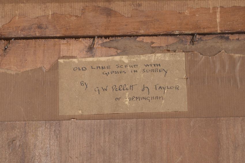 'Old Lane Scene with Gipsies in Surrey', oil on board, oval mount,