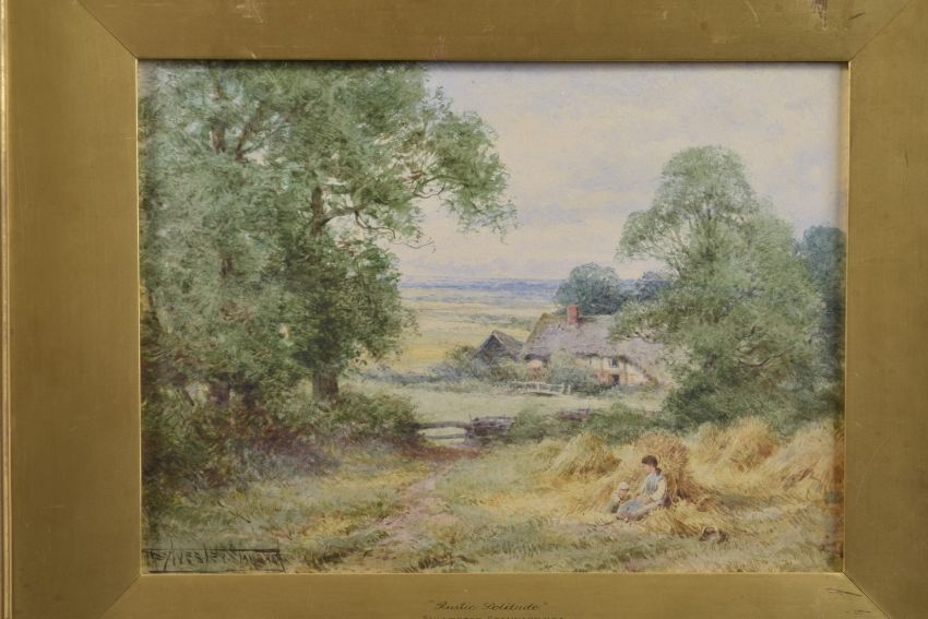 'Rustic Solitude', landscape with path to a thatched cottage and figures resting on haystacks,