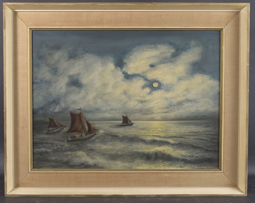'Outward Bound Moonlight' seascape with fishing boats leaving harbour.
